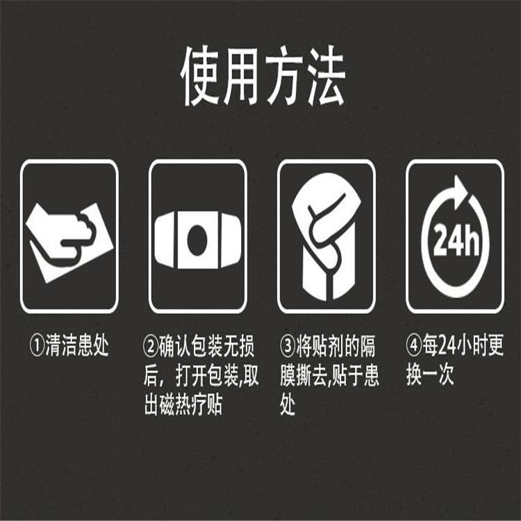 | 使用方法 | 清洁患处,确认包装无破损后,打开包装,取出磁热疗贴,将贴剂的隔离膜撕去,贴于患处,每24小时更换一次。 |