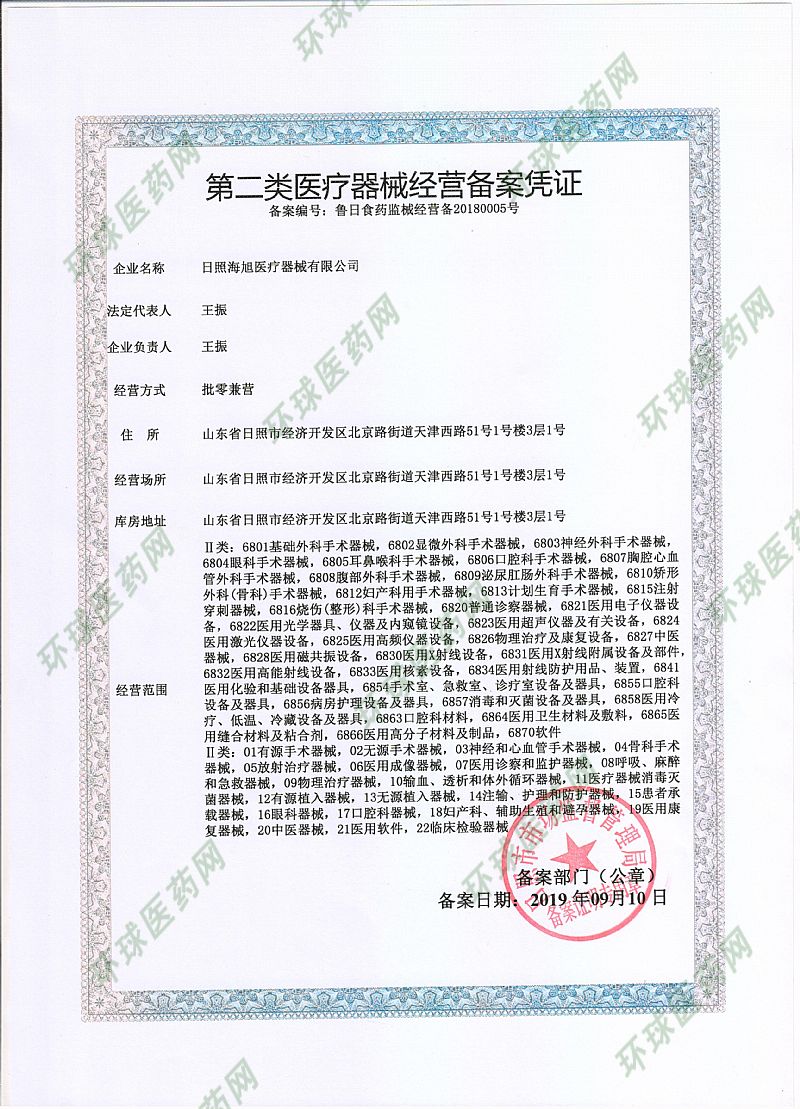 | 其它说明 | 日照海旭医疗器械有限公司成立于2006年,位于美丽的海滨城市--日照,是一家专业生产械准字号的贴剂生产厂家。目前以专业研发、生产和销售械准字号贴剂为主要业务,是山东省专业的贴剂生产基地。 |
