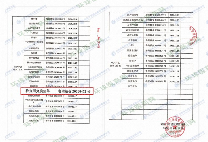 | 产品名称 | 检查用覆膜垫单 |