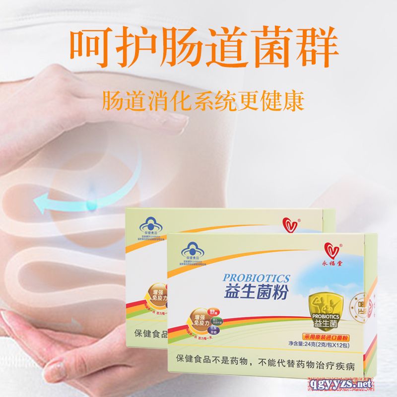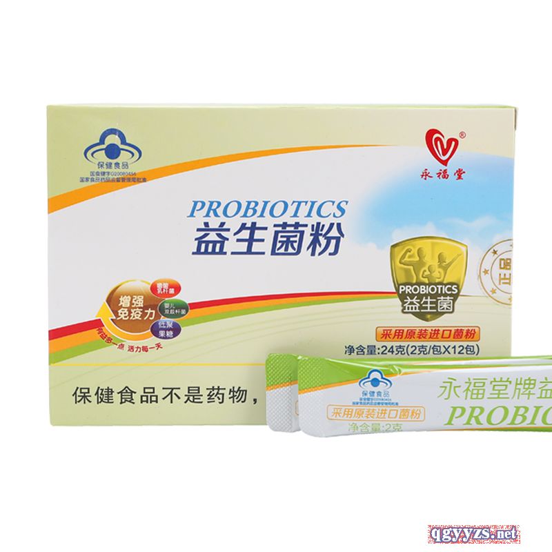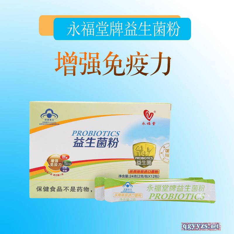 | 作用机理 | 本品是以婴儿双歧杆菌冻干粉、嗜酸乳杆菌冻干粉、低聚果糖、麦芽糊精为主要原料制成的保健食品,经动物功能试验证明,具有增强免疫力的保健功能。 产品名称:永福堂牌益生菌粉 主要原料:婴儿双歧杆菌冻干粉、嗜酸乳杆菌冻干粉、低聚果糖、麦芽糊精 功效成分/标志性成分含量:每100g含:婴儿双歧杆菌1.0x108cfu、嗜酸乳杆菌1.0x108cfu 保健功能:本品经动物实验评价,具有增强免疫力的保健功能 |