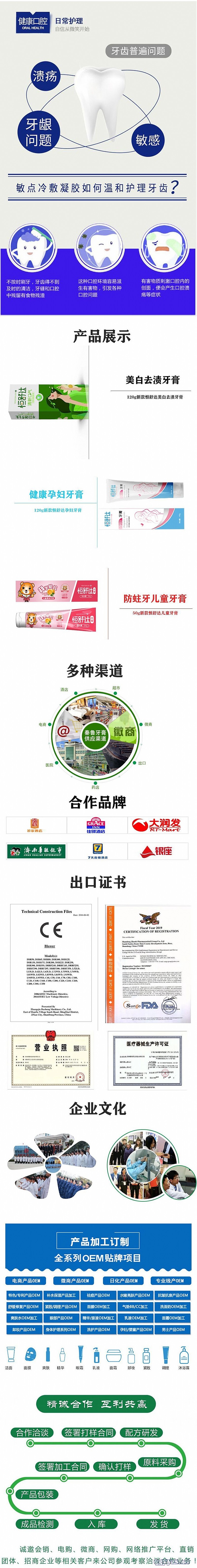 | 产品卖点 | 牙膏OEM代工优势: 1、按客户品牌定制; 2、定制包装材质,可采用镭射包装普通包装灰卡、白卡等多种材质; 3、定制香型,可选多种香型,如流行的清新薄荷、清新西柚、草莓薄荷、姜盐等; 4、定制膏体,包括颜色、透明膏体、高中低档次等; 5、定制印刷文字,中文、英文、法文等文字; 6、定制外包装规格,普通规格一般是72支每箱,也可根据客户的要求定制; 7、定制功能,如美白牙膏、含氟牙膏、保健品牙膏等; |