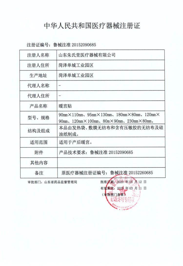 | 用法用量 | 确认包装无破损后,打开包装,取出暖宫贴,将贴剂的隔离膜撕去,贴于患者下腹正中脐下三指对应 的“气海穴”的内裤外侧,每24小时更换一次,流产连续使用5~10天;顺产连续使用10~15天;剖宫产连续使用15~20天。 |