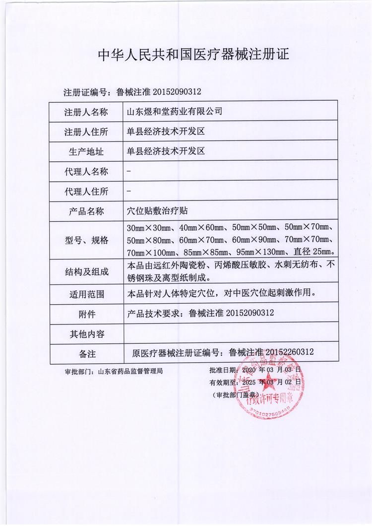 | 产品卖点 | 本品由远红外陶瓷粉、丙烯酸压敏胶、水刺无纺布、不锈钢珠及离型纸制成。穴位贴敷治疗贴的压敏胶布剥离强度不小于1.0N/cm,持粘性应不大于2.5mm,远红外发射波长范围8um-15u |