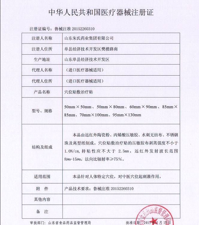 | 产品卖点 | 本品由远红外陶瓷粉、丙烯酸压敏胶、水刺无纺布、不锈钢珠及离型纸制成。穴位贴敷治疗贴的压敏胶布剥离强度不小于1.0N/cm,持粘性应不大于2.5mm,远红外发射波长范围8um-15u |