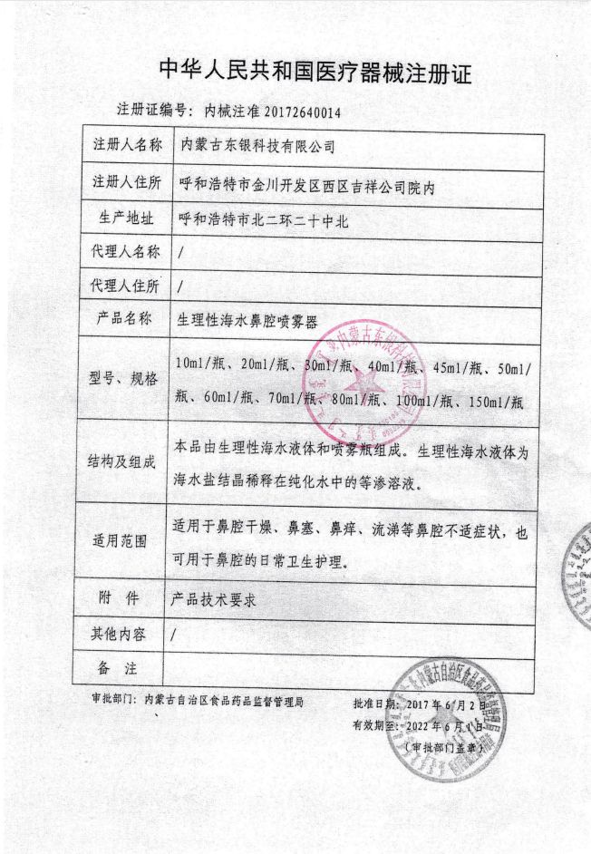 | 补充说明 | 1、 银诺洁生理性海水鼻腔喷雾器可为人体提供所需的矿物质和海水微量元素。修正鼻腔PH值,清洁和湿润鼻腔,改善鼻腔生理功能环境,恢复鼻腔粘膜分泌功能及纤毛运动,提高鼻腔免疫力。 2、 银领生理性海水鼻腔喷雾器是生理性海水提取液,不含药物、不含激素。 3、恢复鼻腔自动分泌及清洁功能,银领生理性海水鼻腔喷雾器能帮助鼻腔分泌功能自动恢复正常,这是其他药物无法办到的。让我们来看一下是如何发挥这种功效--当适当的压力与微米级的水雾体冲洗鼻腔时,鼻纤毛根部的脏物会经冲洗被带走,使长期伏倒的鼻纤毛能脱离纠结的脏物“站立”起来,恢复鼻腔粘膜分泌粘液及纤毛运动的正常功能,并可保持鼻腔湿润,恢复鼻粘液的正常PH值。 注册证号:内械注准20172640014 |