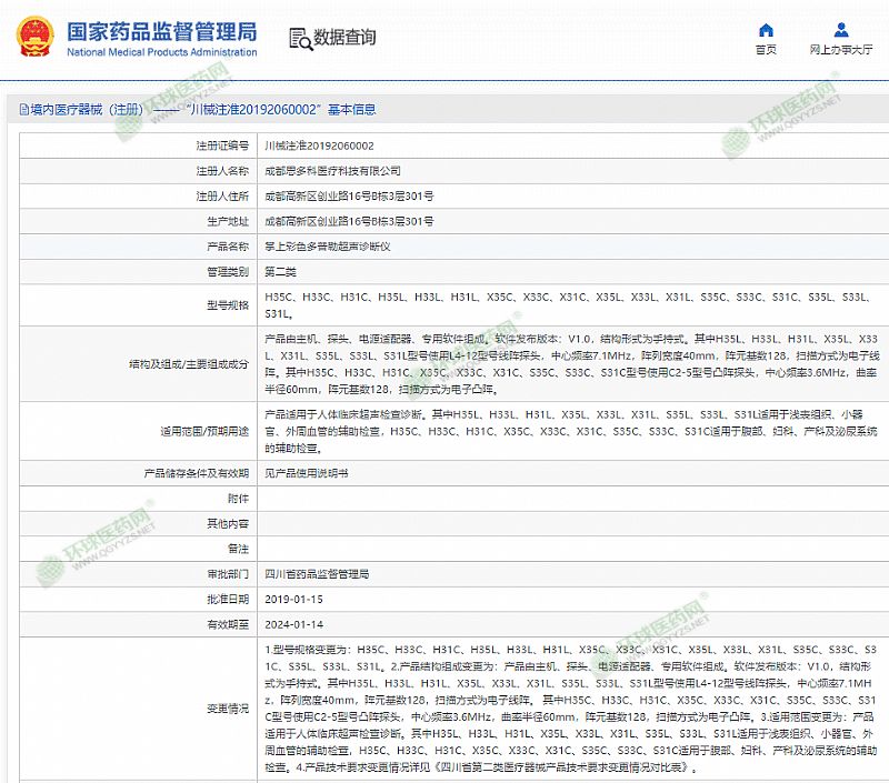 | 主要成分 | 产品由主机、探头、电源适配器、专用软件组成。软件发布版本:V1.0,结构形式为手持式。其中H35L、H33L、H31L、X35L、X33L、X31L、S35L、S33L、S31L型号使用L4-12型号线阵探头,中心频率7.1MHz,阵列宽度40mm,阵元基数128,扫描方式为电子线阵。其中H35C、H33C、H31C、X35C、X33C、X31C、S35C、S33C、S31C型号使用C2-5型号凸阵探头,中心频率3.6MHz,曲率半径60mm,阵元基数128,扫描方式为电子凸阵。 |