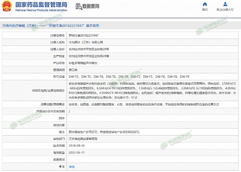 | 主要成分 | 彩色多普勒超声诊断仪由主机(含软件)和探头组成。结构型式为推车式,包括推车式单屏和推车式双屏两种。探头包括:3.5MHzC2-6R65凸阵宽频探头、6.5MHzC4-9R10凸阵宽频探头、7.5MHzL5-12L46线阵宽频探头、3.0MHzP2-5L19相控阵宽频探头、4.0MHzR40凸阵宽频容积探头、6.5MHzC5-9R10凸阵宽频探头;主机包括:超声波发射/接收电路、信号处理和图像显示部分。软件名称:大为彩色多普勒超声诊断仪应用软件;发布版本号:V1.0 |