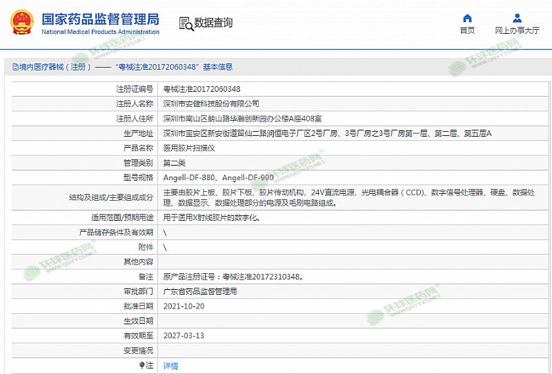 生产企业: 深圳市安健科技股份有限公司