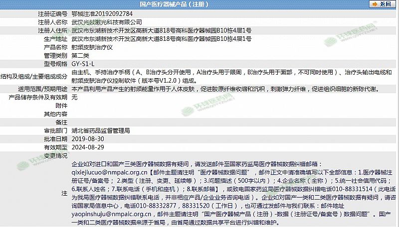 | 主要成分 | 由主机、手持治疗手柄(A、B治疗头分开使用,A治疗头用于眼周,B治疗头用于面部,不可同时使用)、治疗头输出电缆和射频皮肤治疗仪控制软件(版本号V1.2.0)组成。 |