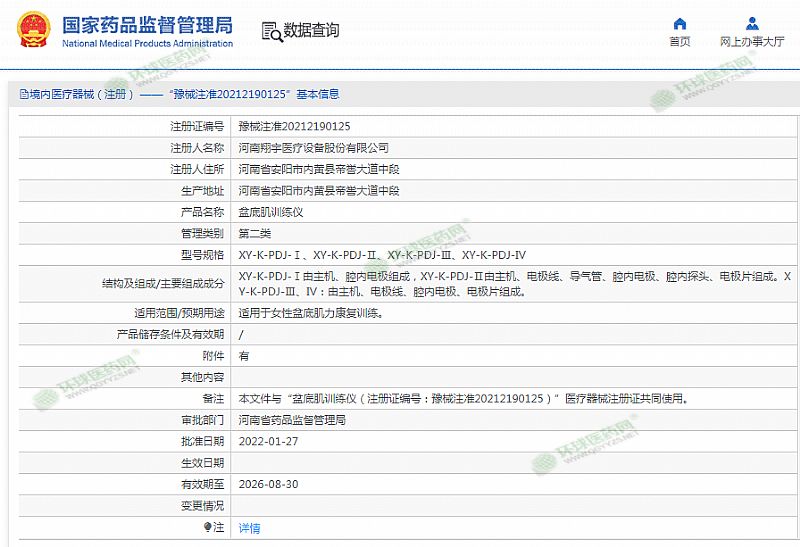| 补充说明 | 产品名称 盆底肌训练仪 管理类别 第二类 型号规格 XY-K-PDJ-Ⅰ、XY-K-PDJ-Ⅱ、XY-K-PDJ-Ⅲ、XY-K-PDJ-Ⅳ 有效期至 2026-08-30 |