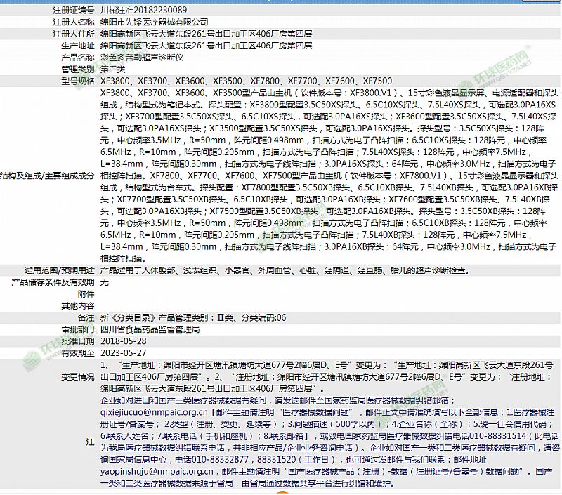| 主要成分 | XF3800、XF3700、XF3600、XF3500型产品由主机(软件版本号:XF3800.V1)、15寸彩色液晶显示屏、电源适配器和探头组成,结构型式为笔记本式。探头配置:XF3800型配置3.5C50XS探头、6.5C10XS探头、7.5L40XS探头,可选配3.0PA16XS探头;XF3700型配置3.5C50XS探头、6.5C10XS探头,可选配3.0PA16XS探头;XF3600型配置3.5C50XS探头、7.5L40XS探头,可选配3.0PA16XS探头;XF3500型配置3.5C50XS探头,可选配3.0PA16XS探头 |