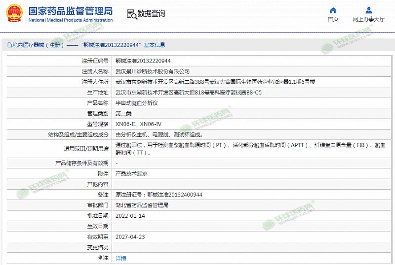 | 补充说明 | XN06系列由测试仪主机、测试杯组成 XN06-II 血凝仪,仪器测试通道为2个 XN06-IV血凝仪,仪器测试通道为4个 有效期至 2027-04-23 |