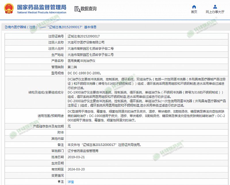 | 产品用途 | DC型适用于滴虫性、霉菌性、细菌性阴道炎的治疗及皮炎、湿疹、带状疱疹、II度烧烫伤、糖尿病足表浅炎症性皮肤病的辅助治疗;DC-1900适用于皮炎、湿疹、带状疱疹、II度烧烫伤、糖尿病足表浅炎症性皮肤病的辅助治疗;DC-2000适用于滴虫性、霉菌性、细菌性阴道炎的治疗。 有效期至 2024-03-20 |