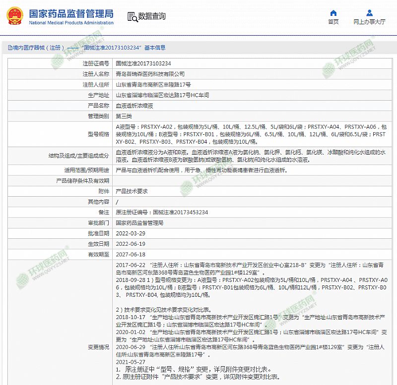 | 产品用途 | 产品与血液透析机配合使用,用于急、慢性肾功能衰竭患者进行血液透析。 有效期至 2027-06-18 |