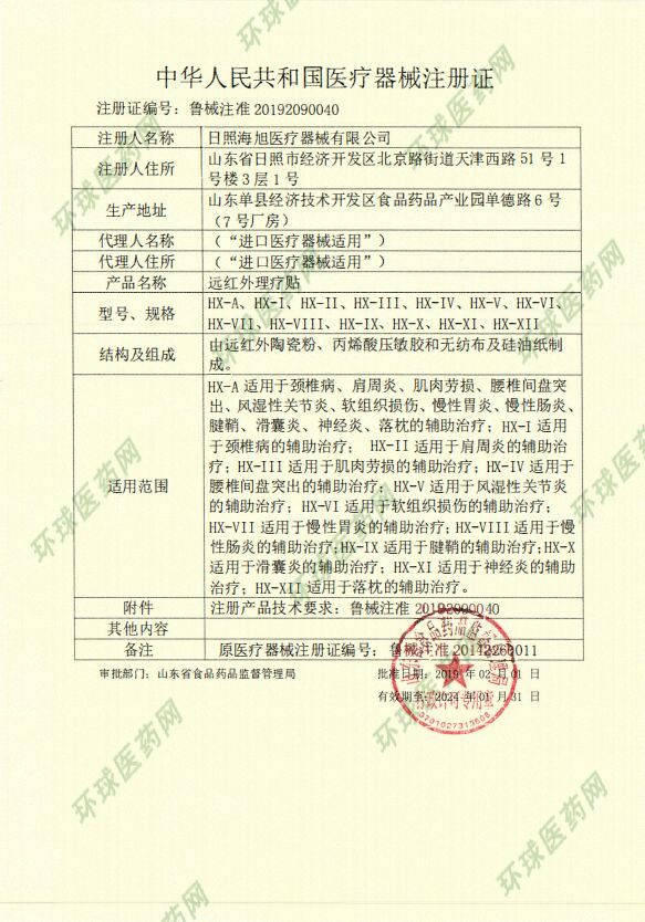 | 补充说明 | 【产品名称】远红外理疗贴 【产品结构】远红外理疗贴由远红外陶瓷粉.丙烯酸压敏胶和无纺布及硅油纸组成。 【适用范围】适用于颈椎病、肩周炎、肌肉劳损、腰椎间盘突出、风湿性关节炎、软组织损伤、慢性胃炎、慢性肠炎、腱鞘炎、滑囊炎、神经炎、落枕的辅助治疗。 【使用方法】清洁患处,取出贴剂揭开防粘层,将胶面贴于患处,轻轻按压即可,每24小时更换一次。 【禁 忌 症】皮肤病、急性期炎症患者、皮肤溃烂处、孕妇下腹部禁用。 【贮 存】密封,置阴凉干燥处保存 【执行标准】YZB/鲁0192-2011 【生产许可】鲁食药监械生产许20110057号 【注册证号】鲁食药监械(准)字2014第2260011号 【规 格】7cm×10cm×3贴×2袋 【生 产】日照海旭医疗器械有限公司 【地 址】莒县城阳东工业园 |