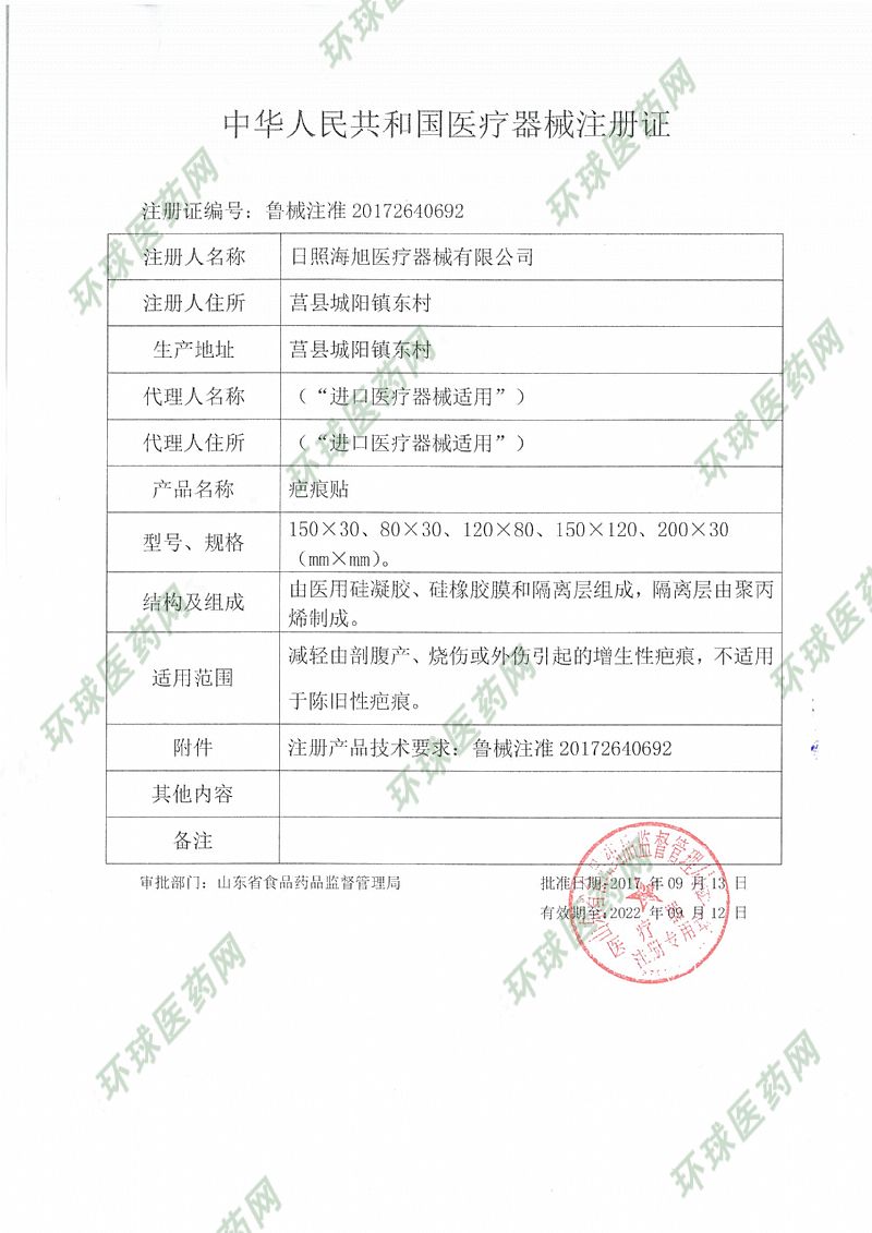 | 补充说明 | 【产品名称】疤痕贴 【型号规格】150mm×30mm、80mm×30mm、120mm×80mm、150mm×120mm、200mm×30mm 【结构性能】产品由医用硅凝胶、硅橡胶膜和隔离层组成,隔离层由聚丙烯制成。水蒸汽透过≥2.2g/m2?24小时、粘着力≥0.2N/20mm、拉断伸长率≥250%、拉伸强度应≥0.7MPa、可伸展性≤4N/cm、**变形≤5%。 【适用范围】减轻由剖腹产、烧伤或外伤引起的增生性疤痕,不适用于陈旧性疤痕。 【注意事项】1、本品必须在伤口结痂脱离,伤口愈合完好后使用;2、过敏暂停使用。 【禁忌症】1、伤口未愈合者禁用;2、对硅橡胶类有皮肤过敏史者慎用。 【使用说明】1、在伤口愈合七天以后,开始使用本产品。2、前两天,每天应该只使用4小时;接下去的两天,每天可延长至8小时;当皮肤适应后,每日可增加4小时,必须每日使用*少12小时,方能达至*佳效果。3、本产品单次使用应小于24小时,可多次使用。4、治疗增生性疤痕越早使用本产品越好。 【使用步骤】 1、使用前先将疤痕部位清洗干净或用棉签蘸取75%的酒精擦拭消毒,晾干;2、打开包装,取出疤痕贴;3、使用时,伤疤一定是干燥的,避免伤疤处湿润;4、去掉隔离层,将有粘性的一面贴在疤痕处,紧密贴敷;5、尽可能一天24小时都贴住,洗澡或是看伤疤*好一天一次为限。 【注册证号】鲁械注准20172640441 【产品技术要求编号】鲁械注准20172640441 【生产许可证号】鲁食药监械生产许20130026号 【注册人】日照海旭医疗器械有限公司 【生产地址】单县经济技术开发区 【售后服务机构】日照海旭医疗器械有限公司 【生产日期】见单包装 【使用期限】三年(由加速试验获得)。 【储存条件】室温保存 |