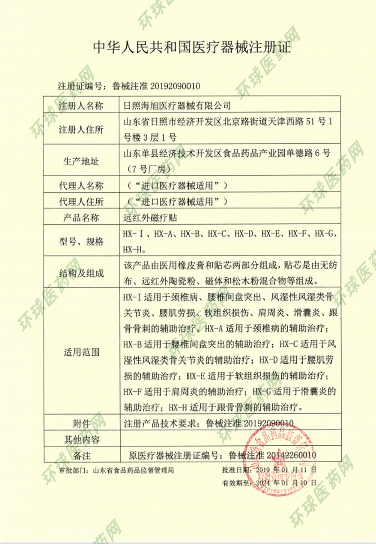 | 补充说明 | 【产品名称】远红外磁疗贴 【产品型号】HX-D 【产品结构】该产品由医用压敏胶和贴芯、远红外陶瓷粉、磁体等组成。 【适用范围】适用于腰肌劳损的辅助治疗。 【使用方法】使用本品时,先清洁患部皮肤,揭去防粘膜将本品直接贴于患处,将胶膜紧贴皮肤并压紧周边,使粘贴材料贴实。2-3日更换一次。 【禁 忌 症】局部皮肤破损、感染者、孕妇禁用;佩带心脏起搏器者禁用皮肤过敏者慎用。 【贮 存】密封、置阴凉干燥处保存。 【执行标准】YZB/鲁0098-2008 【生产许可】鲁食药监械生产许20110057号 【注册证号】鲁食药监械(准)字2014第2260010号 【规 格】9.5cm×13cm×1贴×3袋x300盒/件 【生 产】日照海旭医疗器械有限公司 【地 址】莒县城阳东工业园 【生产日期】见封口 【有效日期】二年 |