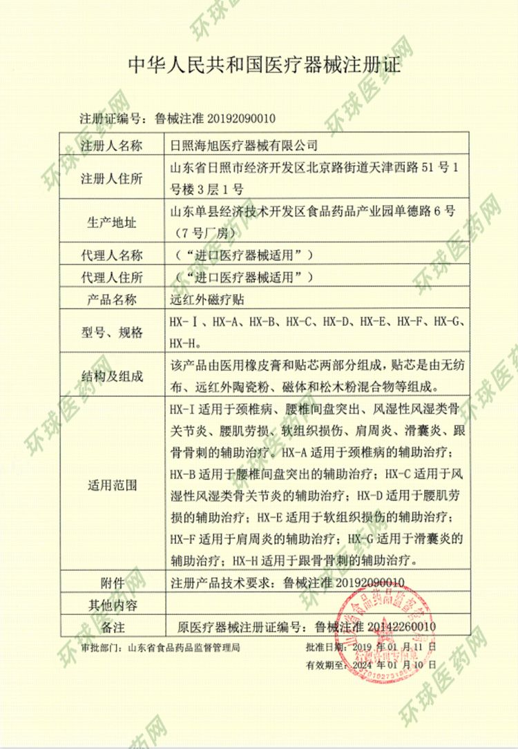 | 补充说明 | 【产品名称】远红外磁疗贴 【产品型号】HX-F 【产品结构】该产品由医用压敏胶和贴芯、远红外陶瓷粉、磁体等组成。 【适用范围】适用于肩周炎的辅助治疗。 【使用方法】使用本品时,先清洁患部皮肤,揭去防粘膜将本品直接贴于患处,将胶膜紧贴皮肤并压紧周边,使粘贴材料贴实。2-3日更换一次。 【禁 忌 症】局部皮肤破损、感染者、孕妇禁用;佩带心脏起搏器者禁用皮肤过敏者慎用。 【贮 存】密封、置阴凉干燥处保存。 【执行标准】YZB/鲁0098-2008 【生产许可】鲁食药监械生产许20110057号 【注册证号】鲁食药监械(准)字2014第2260010号 【规 格】9.5cm×13cm×1贴×3袋x300盒/件 【生 产】日照海旭医疗器械有限公司 【地 址】莒县城阳东工业园 【生产日期】见封口 【有效日期】二年 |