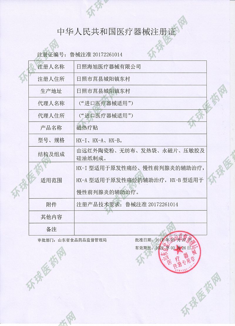 | 补充说明 | 【产品名称】磁热疗贴 【型号】HX-A 【结构及组成】由远红外陶瓷粉、无纺布、发热袋、永磁片、压敏胶及硅油纸制成。 【适用范围】HX-A型适用于原发性痛经的辅助治疗。 【注意事项】1、仅限一次性使用,用后销毁; 2、包装如有破损,严禁使用; 3、使用时严格按照使用说明进行; 4、服帖后无热感,如有过敏等不适,应停止敷贴。 【慎用】皮肤感觉障碍、过敏体质、糖尿病、小儿患者。 【禁忌症】24小时急性创伤的局部、皮肤破损、高热患者、急性期炎症患者、孕妇下腹部、血友病患者、活动性结核患者、恶性肿瘤患者。 【警示】防止烫伤,当热源使用有不适或症状加重时,及时就医。 【使用说明】清洁患处,确认包装无破损后,打开包装,取出磁热疗贴,将贴剂的隔离膜撕去,贴于患处,每24小时更换一次。 【规格】90mmX110mmX1贴X3袋 【注册证编号】鲁械注准201722611014 【产品技术要求编号】鲁械注准20172261014 【生产许可证号】鲁食药监械生产许20110057号 【生产单位】日照海旭医疗器械有限公司 【生产地址】山东单县经济技术开发区食品药品产业园单德路6号(7号厂房) 【注册地址】山东省日照市莒县城阳街道东关社区东村(莒州路东侧) 【生产日期】见封口 【有效期】两年 |