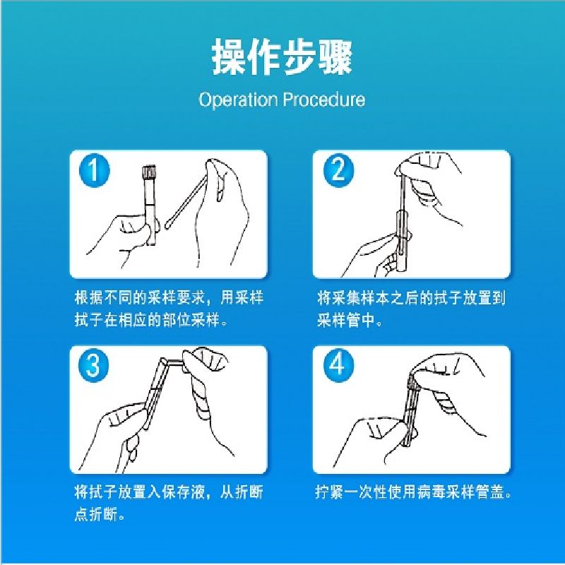| 使用方法 | 1、根据不同的采样要求,用采样拭子在相应的部位采样。 2、将采集样本之后的拭子放置到采样管中。 3、将拭子放置入保存液从折断点折断。 4、拧紧一次性使用病毒采样管盖。 |