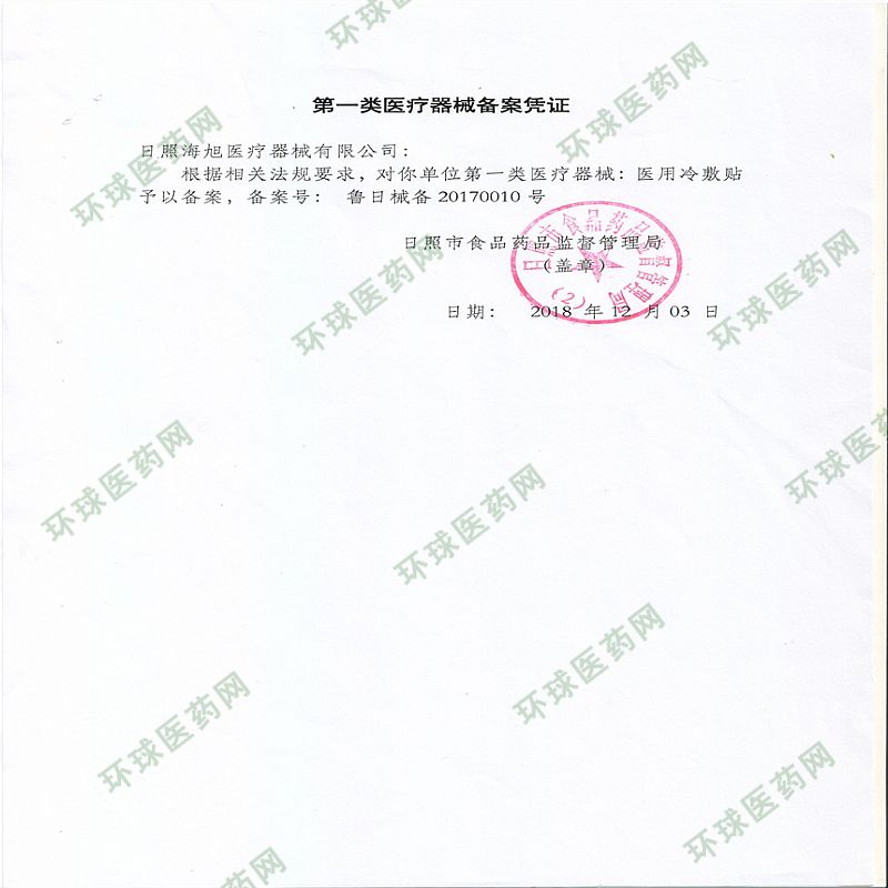 | 其它说明 | 日照海旭医疗器械有限公司是一家集新药研发、贴膏制造与销售于一体的大型企业,专注外用贴膏贴 剂产品 14 年。是山东*大的贴膏生产厂家,全国*大医药生产基地,在全国贴膏企业中享誉盛名,集团先 后获得菏泽市高新技术企业、山东省质量诚信 AAA 级品牌企业、全国消费者信得过 AAA 级品牌企业、 全国诚信示范单位等多项荣誉。秉承“专业,专心,专注”的经营理念,在保障人民健康和促进行业发展 中发挥着越来越重要的作用。 |