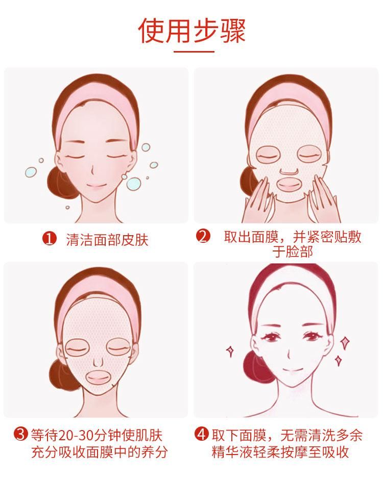 | 使用方法 | 1、面部清洁后,取出面膜。 2将面膜轻敷于全脸,约20-30分钟后取下。 3、将剩余面膜液轻轻按摩至皮肤吸收。 4、使用后请抛弃,每天使用效果最佳。 |