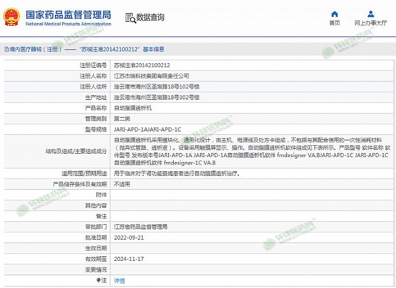 | 产品用途 | 用于临床对于肾功能衰竭患者进行自动腹膜透析治疗。 有效期至 2024-11-17 |