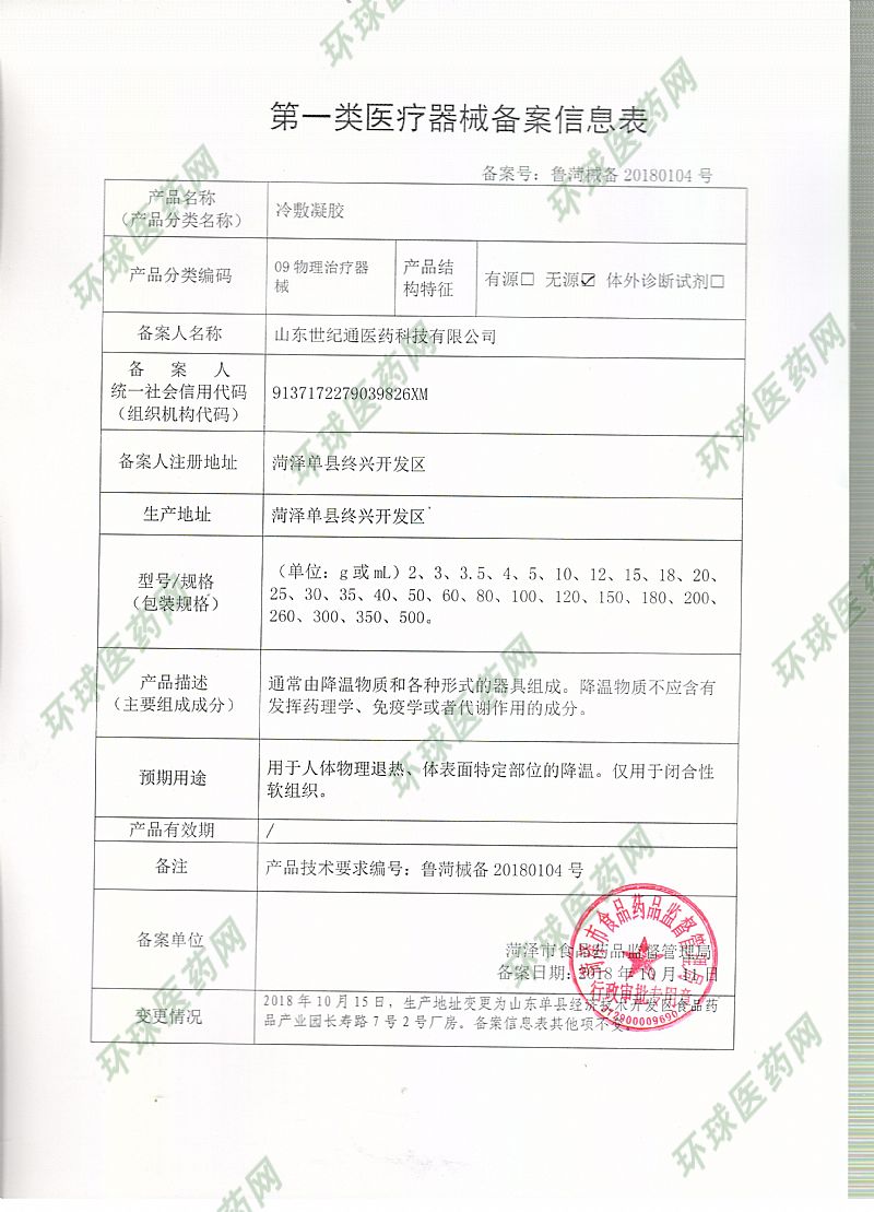 | 补充说明 | = [产品描述] 本品由降温物质和**形式的外套及固定器具组成。降 温物质不含具有发挥药理学、免疫学或者 新陈代谢作用的成分。 [预期用途] 用于颈椎、腰椎、肩周、关节、坐骨神经、 腰椎间盘、痛风乳腺、前列腺等部位闭合性软组织的冷敷理疗。 物理退热。 仅用于闭合性软组织。 厂子直销低价批发、代理,可OEM/贴牌代加工 |