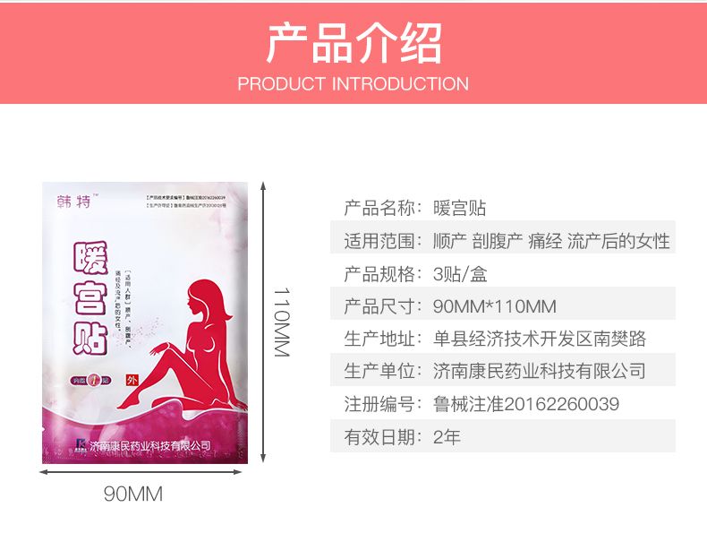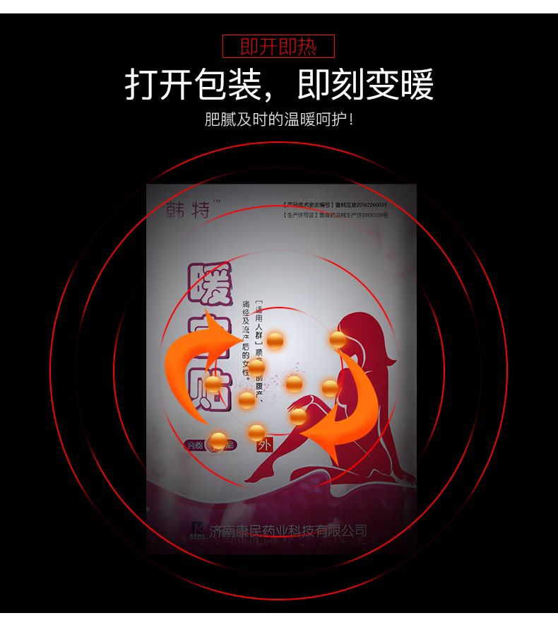 | 补充说明 | 使用方法 1.撕开包装,即开即用,包装为真空包装产品遇到空气即会物理发热 2.打开两边胶布胶膜,尽量减少手指与胶带接触,以免降低粘性 3.选取穴位,肚脐往下横向三指,按穴位贴效果明显,详情可咨询客服 4.可贴在皮肤上,如果感觉温度过高,可将温控贴贴于暖宫贴中间,防止烫伤 厂子直销低价批发、代理、招商,可OEM/贴牌代加工、打样、加工等。 |