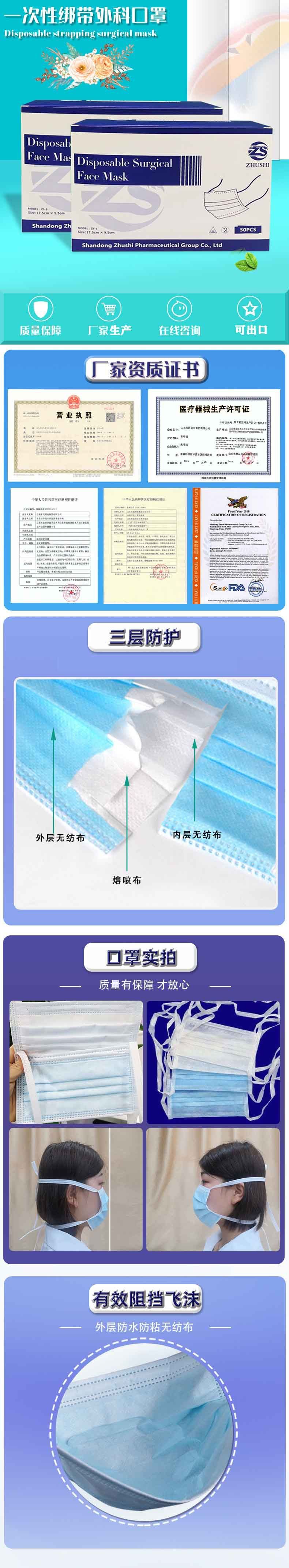 | 产品用途 | 一次性绑带口罩 三证齐全三层防护现货速发 牢固耐拉扯不易坏 超声波精准点焊牢固耐拉扯无惧脱落更放心 三层防护层层过滤 飞沫花粉粉尘病毒 **层:阻隔大颗粒粉尘、细菌 第二层:过滤微小病毒 第三层:不含玻璃纤维,保护肌肤 细菌过滤效率≥99% |
