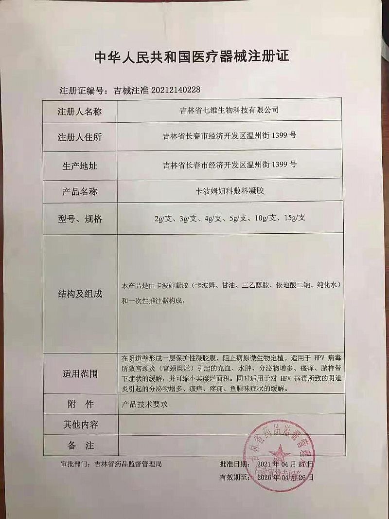 | 补充说明 | HPV卡波姆妇科敷料凝是由卡波姆凝胶和一次性推注器构成,胶颜色应为无色或浅黄色,色泽均匀,外形应端正,无明显的变形和残缺,表面应光滑,无锋棱、毛刺,平均装量不少于标示装量,每个容器装量不少于标示装量的93%,pH值应为4.5~7.0,凝胶中细菌菌落总数(cfu/g)应≤100,真菌菌落总数(cfu/g)应≤100,金黄色葡萄球菌、大肠菌群、绿脓杆菌、溶血性链球菌不得检出。该产品适用于HPV病毒所致宫颈炎(宫颈糜烂)引起的充血、水肿、分泌物增多、瘙痒、脓样带下症状的缓解,并可缩小其糜烂面积。同时适用于对HPV病毒所致的阴道炎引起的分泌物增多、瘙痒、疼痛、鱼腥味症状的缓解。该产品为一次性使用产品。 |
