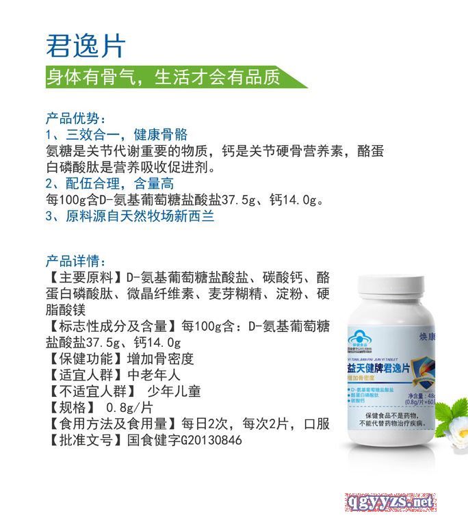 | 补充说明 | 1、氨糖是形成软骨细胞的重要营养素之一,也是软骨基质和关节液的基本成分。有助于修复关节软骨,催生和补充关节滑液,清楚关节腔垃圾,提高骨骼免疫力。2、钙是**人体骨骼和牙齿健康的一种必要的矿物质,骨钙的数量减少了,骨的坚实程度自然会下降。所以维持骨健康,要适量补钙。3、酪蛋白磷酸肽能使游离钙保持较高的浓度,促进钙的被动吸收。 产品优势 1. 高含量:标志性成分:1,每100g含:D-氨基葡萄糖盐酸盐37.5g;钙14.0g; 2. 氨基葡萄糖盐酸盐:能促进人体粘多糖的合成,提高关节滑液的粘性,能改善关节软骨的代谢 3. 钙含量高,补充钙元素 4. 酪蛋白磷酸肽促进钙吸收 5. 增加骨密度,—修复软骨,强健骨骼! 6. 原料源自天然牧场新西兰 7. 全国**产品 8. 国家食品药品监督管理局批注的保健食品,功能成分以及含量都有严格的执行标准 9. 新产品上市全国招商 10. 销量好,产品**高 规格:0.8g一片 【主要原料】D-氨基葡萄糖盐酸盐、碳酸钙、酪蛋白磷酸肽、微晶纤维素、麦芽糊精、淀粉、硬脂酸镁 【标志性成分及含量】每100g含:D-氨基葡萄糖盐酸盐37.5、钙14.0g 【保健功能】具有增加骨密度的保健功能 【适宜人群】中老年人 【食用方法及食用量】每日2次,每次2片,口服 【产品规格】0.8g/片 【保质期】24个月 【贮藏方法】密封,常温干燥处保存 【批准文号】国食健字G20130846 【生产商】山东健康源生物工程有限公司 |