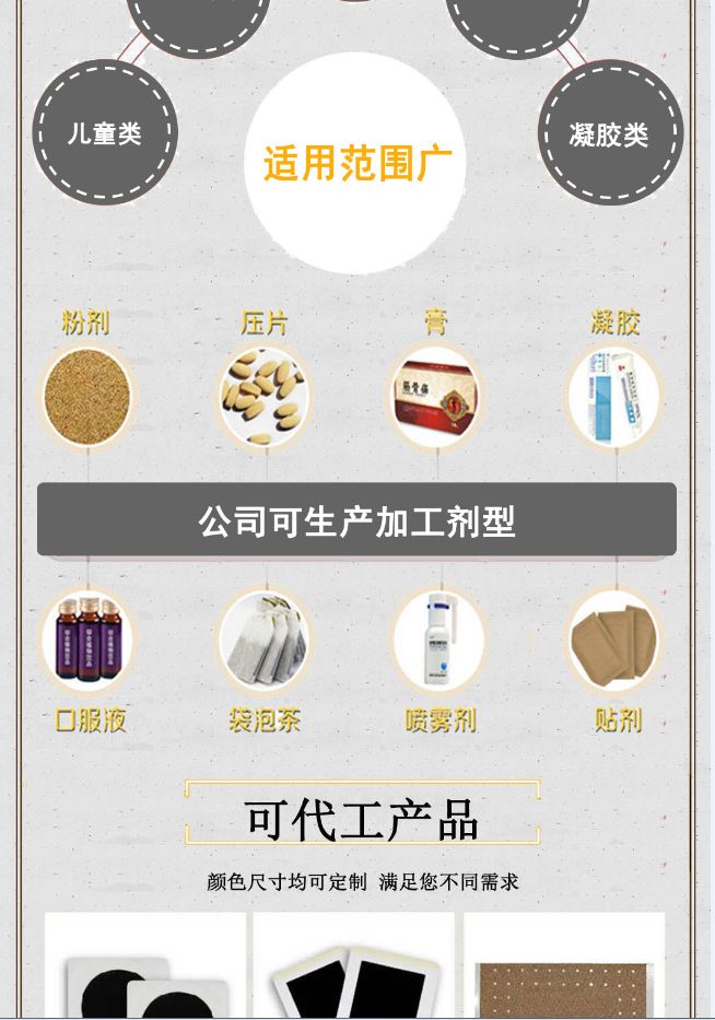 | 补充说明 | 贴代牌加工,形状规格大小可定制 产品系列:各类贴剂、膏剂、膏药、消毒消用杀品、化妆品、保健食品、日化用品、保健产品、临床产品、耗材列系等 |