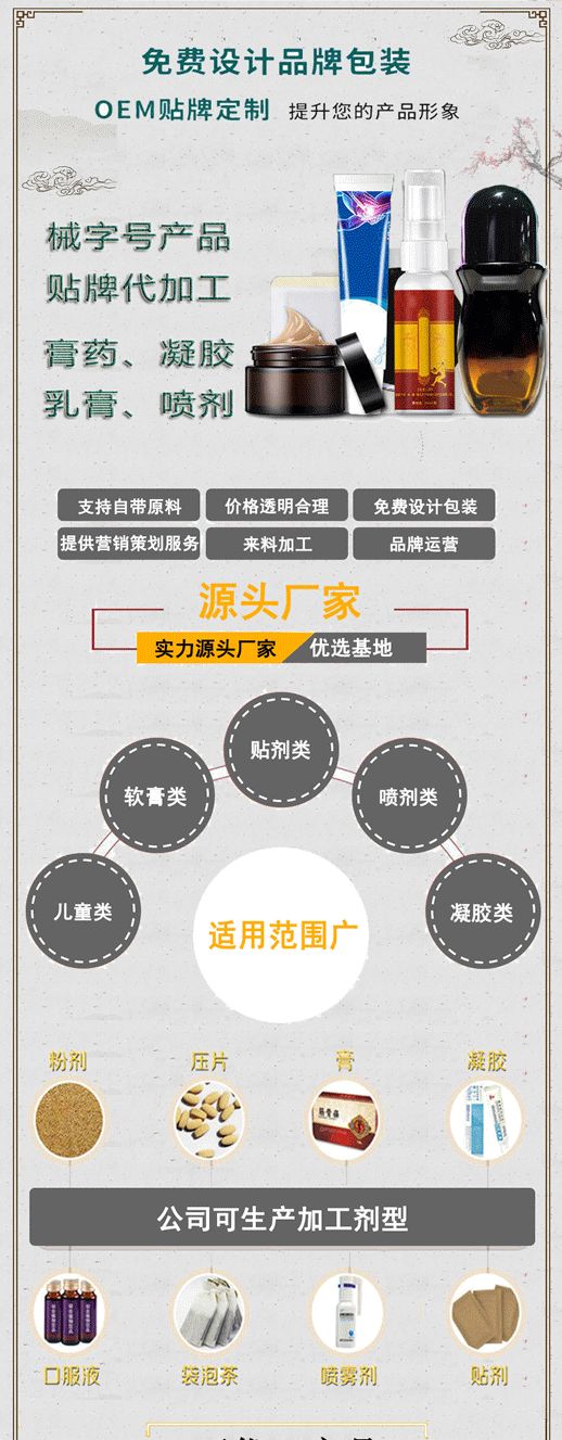 | 补充说明 | 贴代牌加工,形状规格大小可定制 产品系列:各类贴剂、膏剂、膏药、消毒消用杀品、化妆品、保健食品、日化用品、保健产品、临床产品、耗材列系等 |