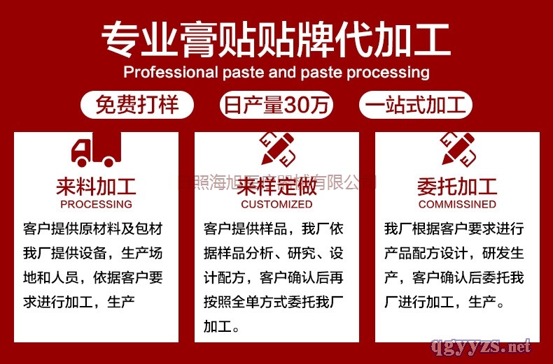 | 产品用途 | 膏药代加工企业膏药厂膏药加工 1:免熬膏药基质生产方便,不含铅丹,但是易造成污染,运输,贮存不方便,且生产成本高。,3:溶剂型热熔压敏胶膏药基质,持久性好,但膏药生产工艺复杂,成本高,污染大。 厂家免费热线:18678567207(同微信)高经理 海旭医疗黑膏药贴牌产品优势:1、海旭膏药有消肿、拔毒、生肌、除寒等效果。2、深层穴位渗透,通经舒络、行气活血、消炎止痛,达到强筋健骨之功效。3、通过材料刺激,形成神经条件反射,调节机体功能,促进抗体形成,提高人体免疫力。4、营养、修复病变的细胞,钝化骨刺、消除肿胀、解除僵硬状态。5、刺激关节软骨组织,肌肉骨骼免疫功能得到恢复,骨关节疾病逐步康复,活动自如。6、调节气血,平衡阴阳;促进新陈代谢,增强关节功能,日照海旭医疗器械有限公司黑膏药厂家。主要生产,黑膏贴,红外理疗贴、磁疗贴、穴位敷贴、灸热贴、退热贴、烫熨治疗包、中医穴位透皮贴,沙蒿子透皮贴、输液加温贴、无菌敷贴等医院和终端产品 |