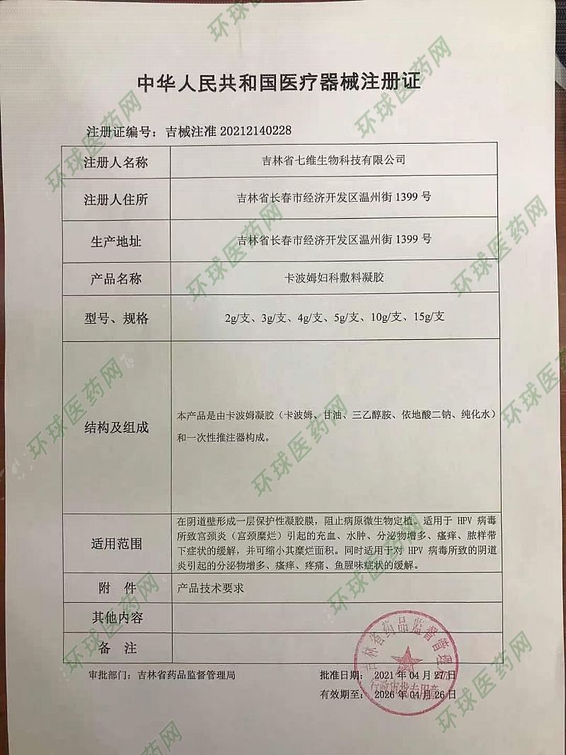 | 补充说明 | 2021年批复的二类医疗器械 蕾好Hpⅴ卡波姆妇科辅料凝胶 4g/支/盒×400盒/件 |