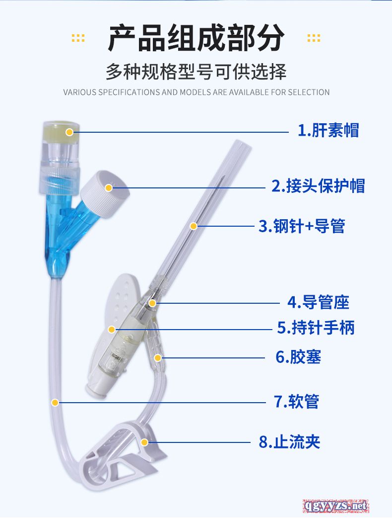 | 主要成分 | Y型留置针主要由不锈钢针管、导管(套管)、金属楔、导管座(Y型)、隔离塞、针管座、长导管(连接管)、长导管连接座、肝素帽、螺旋帽、滑动夹紧板、针管保护套组成。 |