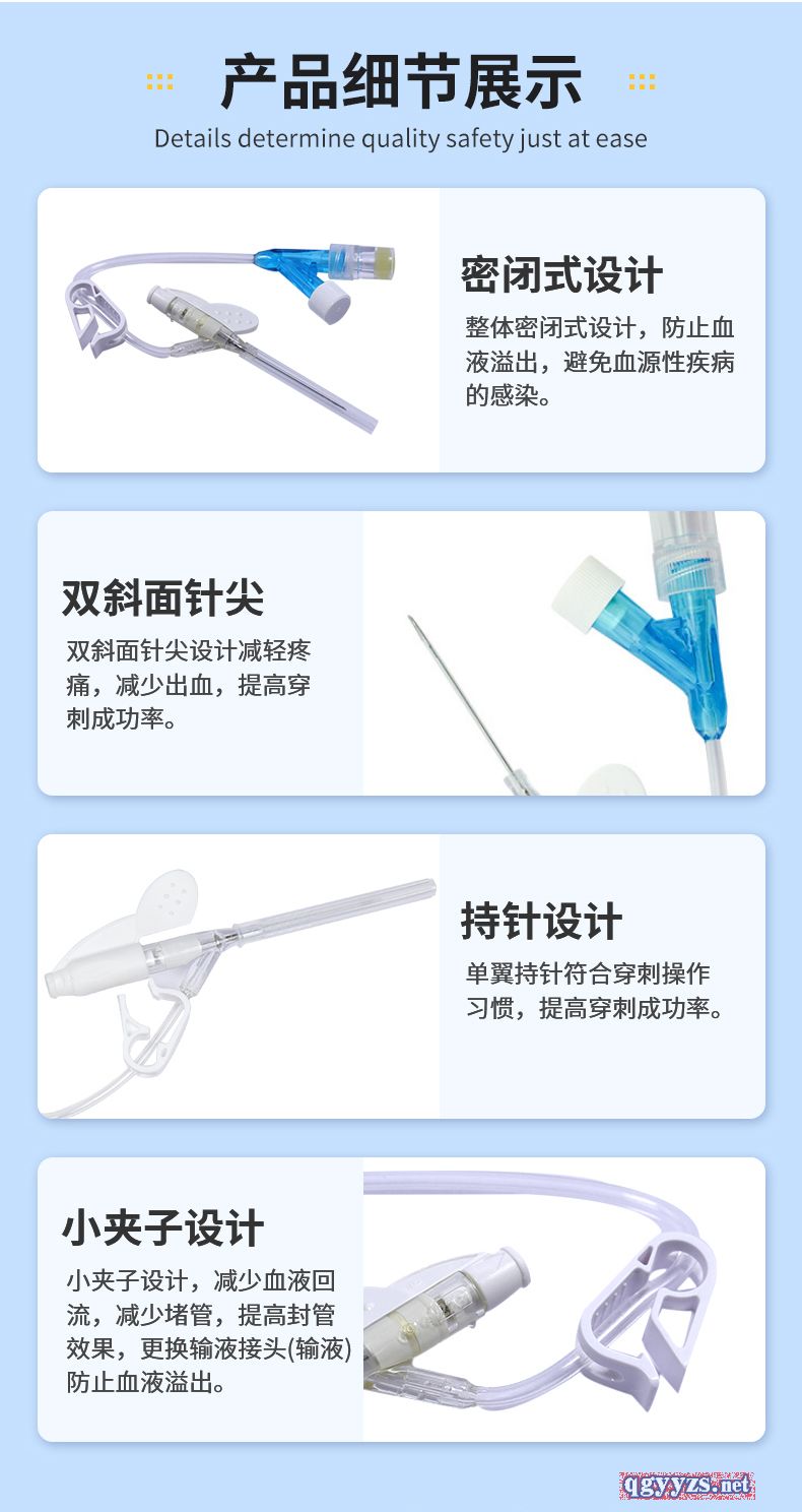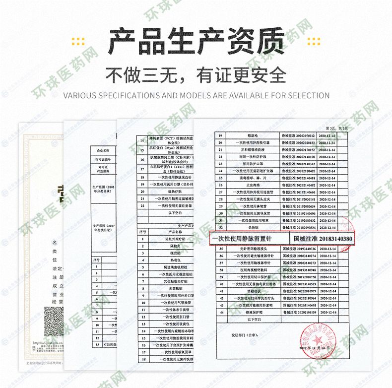 | 补充说明 | 产品名称:一次性使用静脉留置针 产品规格:Y型,18G、20G、22G、24G、26G 医疗器械产品注册证证号:国械注准20183140380 生产企业许可证号:鲁食药监械生产许20140053号 适用范围: 本产品供插入人体外周血管静脉系统连续输液用。 主要结构与性能:Y型留置针主要由不锈钢针管、导管(套管)、金属楔、导管座(Y型)、隔离塞、针管座、长导管(连接管)、长导管连接座、肝素帽、 螺旋帽、滑动夹紧板、针管保护套组成。 产品特点: 1.导管柔软,不易损伤血管**输液时的** ;2.避免每天穿刺血管,减轻痛苦,保护血管 ;3.使病人在输液时感觉更为舒适 ;4.提高工作效率 ;5.提高护理质量 适用范围::1.肿瘤科 2.儿科 3.神经内外科 4.普通病房 5.CT室 6.门急诊 预期用途:临床用于留置病人静脉进行输液 产品部件:蝶翼状、肝素帽、滑动夹紧板 |