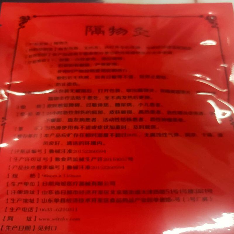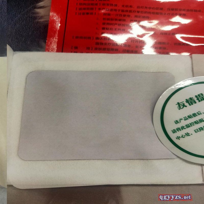 | 使用方法 | 打开包装袋,取出隔物灸后撕去两边胶贴保护纸,将隔物灸贴在人体相关穴位上即可。对胶贴过敏者,可将隔物灸正面对准穴位,反贴在紧身衣上即可。 |