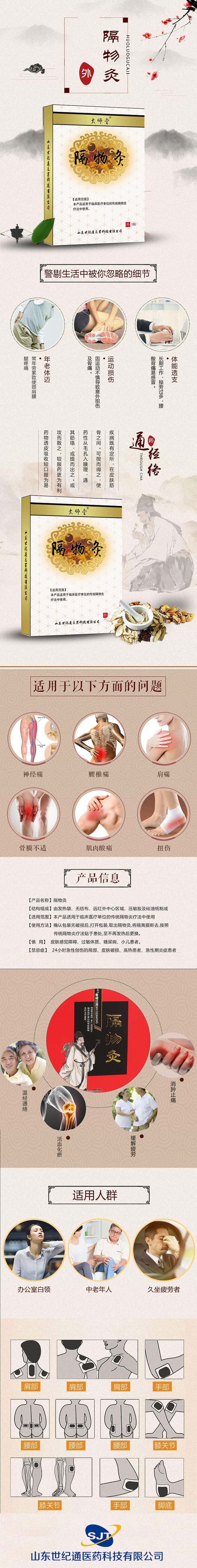 | 补充说明 | 太师堂隔物灸 可以生产代加工贴牌 提供一条龙服务 如果在我们公司做贴膏oem贴牌公司可以提供文号的使用 太师堂隔物灸批发厂家太师堂隔物灸定制加工 隔物灸根据传统灸疗原理设计、制作而成,采用现代化发热技术代替传统艾柱燃烧产热方法,具有传统温灸功效。同时,大伸今隔物灸通过对穴位的持续温灸,疏通痹阻的经络气血,振奋低下或者衰退的功能;平衡失调的阴阳,使人体病痛,恢复健康,。 隔物灸热疗贴,骨科医保耗材,市场大,好操作,厂家招商 产品特点 1、隔物灸采用独特的环保发热技术和先进的热透皮技术,自行发热,热度持久、平稳。 2、隔物灸作用机理是基体原子和分子的基体能量之间发生的共振,使血管扩张,舒经通络。 以传统中医灸疗原理设计、制具有驱风散寒、舒筋活血、消肿止痛的等作用;适用于肩周炎、颈椎病、风湿关节炎、骨质增生、椎间盘突出、跌打损伤、网球肘、扭伤等 发热中药粉药包剂型,可定制,规格根据客户需求 【产品名称】隔物灸【结构及组成】由发热袋、无纺布、远红外中心区域、压敏胶及硅油纸制成。【适用范围】木产品适用于临床医疗单位的传统隔物灸疗法中使用。【使用方法】确认句装无破损后,打开包装,取出隔物灸,将隔离膜撕去,按照传统隔物灸疗法贴于患处,至不再发热后更换。【注意事项】1、仅限一次性使用,用后销毁;2、包装如有破损,严禁使用;3、使用时严格按照使用说明进行;4、敷贴后无热感,如有过敏等不适,应停止敷贴;5、防止烫伤。【慎 用】皮肤感觉障碍、过敏体质、糖尿病、小儿患者。【禁 忌 症】24小时急性创伤的局部、皮肤破损、高热患者、急性期炎症患者、孕妇下腹部、血友病患者、活动性结核患者、恶性肿瘤患者。【警 示】当热源使用有不适或症状加重时,及时就医。【储 存】本产品应贮存在相对温度不超过80%,无腐蚀性气体、阴凉、干燥、通风良好、清洁的环境内。【产品技术要求编号】鲁械注准20152260595【生产许可证】鲁食药监械生产许20110011号【注册证编号】鲁械注准20152260595【规 格】80mm×230mm×1贴【注册人名称】山东世纪通医药科技有限公司【生产地址】山东单县经济技术开发区食品药品产业园长寿路7号2号厂房【注册人住所】菏泽市单县终兴开发区【生产白期】见封口【有效期】两年 |