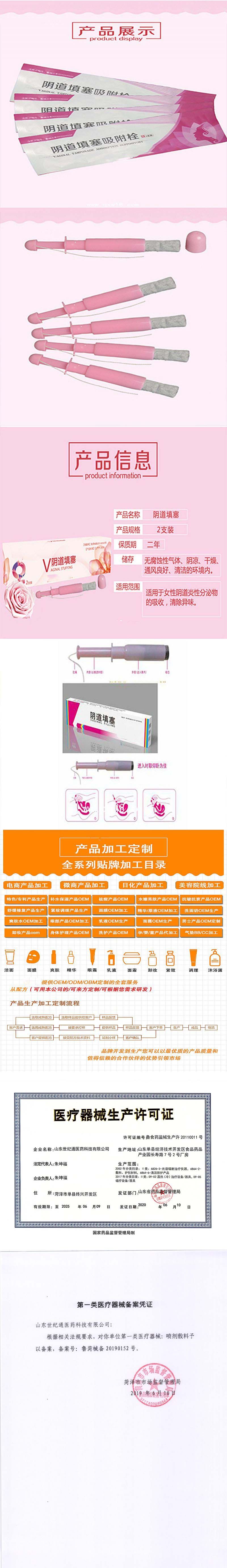 | 产品卖点 | 山东世纪通医药科技面向全国承接阴道填塞吸附栓oem代加工,正规器械类文号,多年操作,欢迎咨询! |