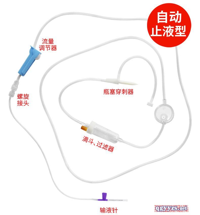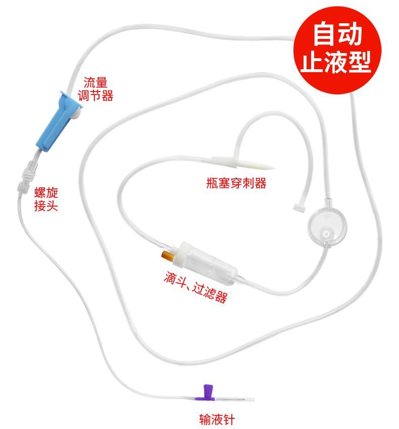 | 主要成分 | 本品由瓶塞穿刺针保护套、瓶塞穿刺针、带空气过滤器和塞子的进气口(塞子可不带)、液体通道、进气器件(可无)、滴管、滴斗、软管、流量调节器、注射件(可无)、精密药液过滤器、管路、夹子(可无)、外圆锥接头、外圆锥接头保护套、一次性使用静脉输液针(可无)。 |