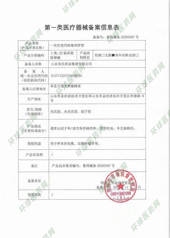 | 补充说明 | 山东朱氏药业集团一次性使用精密过滤输液器(避光性,高透性),一次性使用静脉留置针,一次性使用无菌注射器,一次性使用配药用注射器,医用超声耦合剂,一次性使用真空采血管,一次性使用病毒采样管,一次性使用胃管,一次性使用医用导尿包无菌双腔硅胶尿管成人男女等医疗器械,资质齐全,多个省区中标,欢迎来电咨询: |