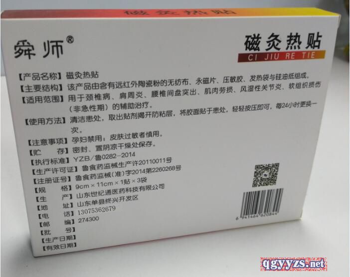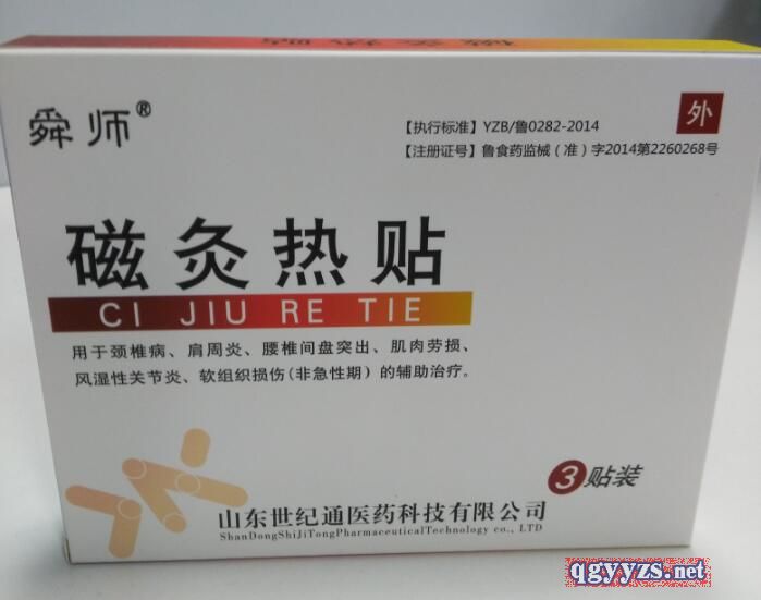 | 产品用途 | 磁灸热贴用于腰椎间盘突出引起的腰部的疼痛、肿胀;肩周炎引起的肩部的疼痛、肿胀;颈型颈椎病、腰肌劳损、风湿性关节炎(非急性期)的辅助治疗。 |