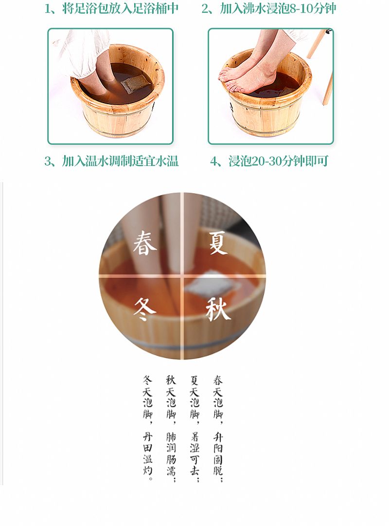 | 使用方法 | 1、取一个药包,用大于95度的热水2000ml浸泡20分钟2、然后用温水调和到40度左右,浸泡双足,每次20分钟3、泡到你的后背感觉有点潮,或者额头微出汗4、用干净的毛巾擦净水 |