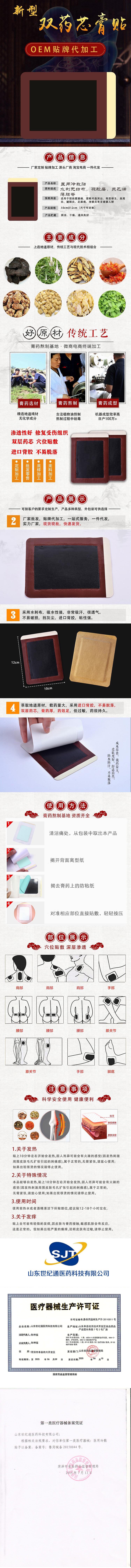 | 补充说明 | 山东世纪通医药科技有限公司经过几年的发展,已经拥有临床产品远红外理疗贴、磁疗贴、热疗贴、穴位敷贴、水凝胶冷敷贴;新剂型产品透皮贴、沙蒿子透皮贴、足贴等多种剂型贴剂产品。公司承接贴剂贴牌、黑贴剂加工等业务,产品疗效卓著,畅销省内外,久享盛誉。形成了以销售过亿产品,过千万产品,迅速成长产品为主导的丰富的明星产品群,为企业长久的发展奠定了扎实的产品线基础。 |