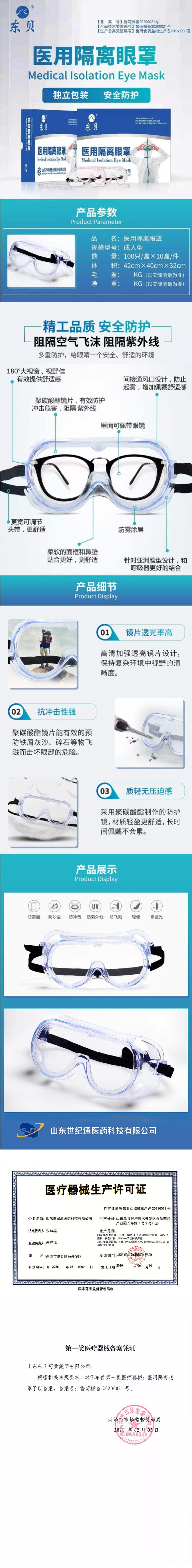 | 补充说明 | 1.佩戴方法:使用双手戴上护目镜,调节舒适度。2.摘除方法:捏住靠近头部或耳朵的一边摘掉,放入回收或医疗废物容器内。注意事项:1.佩戴前应检查有无破损,佩戴装置有无松解;2.一旦被患者体液或血液污染应立即清洁和消毒。3.每次使用后应清洁与消毒。 |