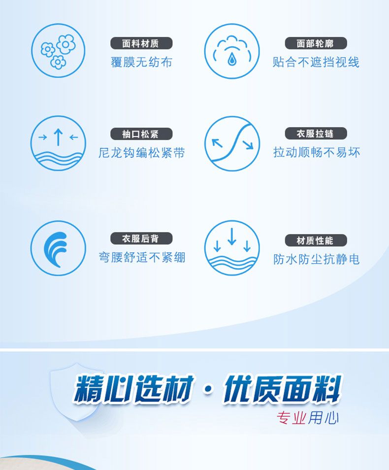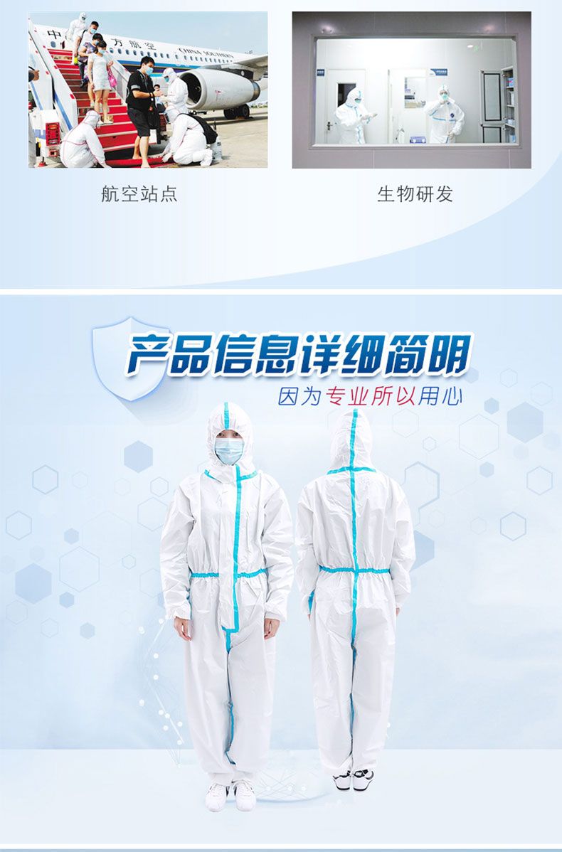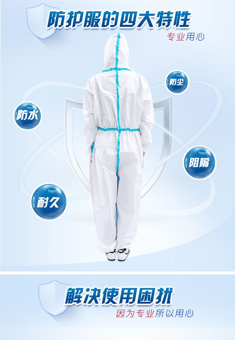 | 使用方法 | 【使用说明】1)使用前,选择合适规格的防护服。2)检查包装是否完好,应遵循先穿下衣,再穿上衣,然后戴好帽子,最后拉上拉锁的顺序。3)将防护服的拉链至衣服的底部,穿套顺序为:双腿-胳膊-头部,依次穿戴好后,最后将拉链拉至下颚处。4)医用一次性防护服在脱下防护手套前要尽量避免接触防护服的外表面,手套脱下后要尽量接触防护服的内表面,防护服脱下后应当是内表面朝外,将外表面和污染物包裹在里面,避免污染物接触到人体和环境。脱下的防护用品要集中处理,避免在此过程中扩大污染。 |