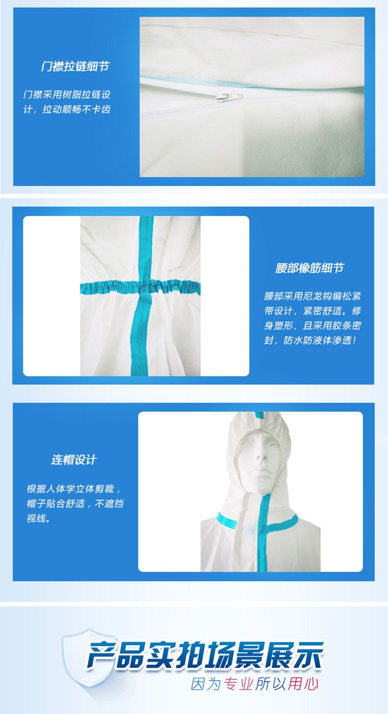 | 作用机理 | 无菌形式提供,产品性能符合GB19082-2009《医用一次性防护服技术要求》,抗合成血液穿透性达到不低于2级的要求,本产品不具备阻燃性能 |