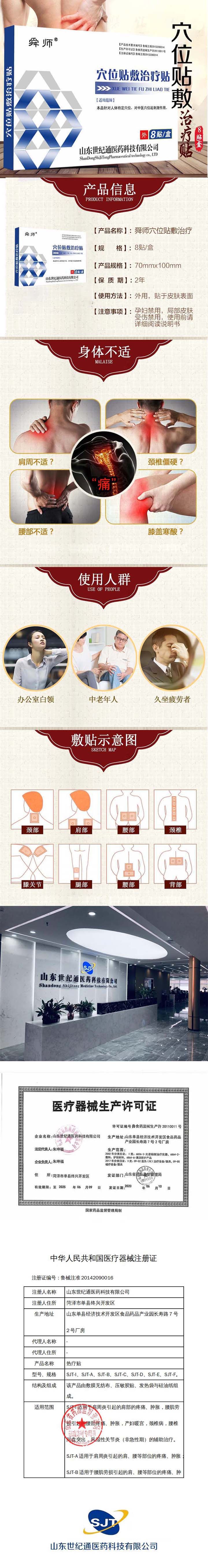 | 产品卖点 | 门诊输液叫停,抗生素使用限制,国家已大力发展中医药。穴位贴敷疗法历史悠久,这也是穴位帖一上市就获得关注和青睐的原因。山东世纪通医药科技,专业生产厂家,实力企业,具有较高的品牌知名度、美誉度,质量优、价格优、服务优。 |